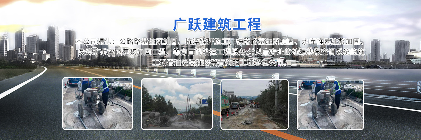徐州廣躍建筑工程有限公司,公司成立于2010年,有專業施工人員50人,從事專業加固注漿施工。 本公司提供:公路路基注漿加固、抗浮錨桿施工、鐵路路基注漿加固、水庫帷幕注漿加固、及煤礦采空區灌漿加固工程、等方面的鉆探工程服務;并從事專業的地源熱泵空調系統的施工和管道安裝連接等有關的工程承包公司。 公司成立以來一直專注于地質鉆井工作,技術力量雄厚、設備先進:擁有專業的機械地質鉆井精英隊伍;并具有GSY --150鉆機30余臺、GSY---200鉆機20余臺、專業回填封孔砂漿泵4臺等機械設備。公司稟承“優質的工程、優惠的價格、優良的售后服務”的經營理念,以“客戶滿意”為原則,著力打造一支高效、專業、信譽的工程服務團隊。 具體服務項目:工程施工降水井、水源空調井、地源熱泵井、機鉆深井(工廠專用井)、石頭井、飲用水井、農田井、地基降水處理、大型基坑降水、地下室、車庫以及橋梁注漿加固等業務。可用于廠生產用水,機械冷卻用水和生活用水,用水量可根據貴公司的需求量身訂做。